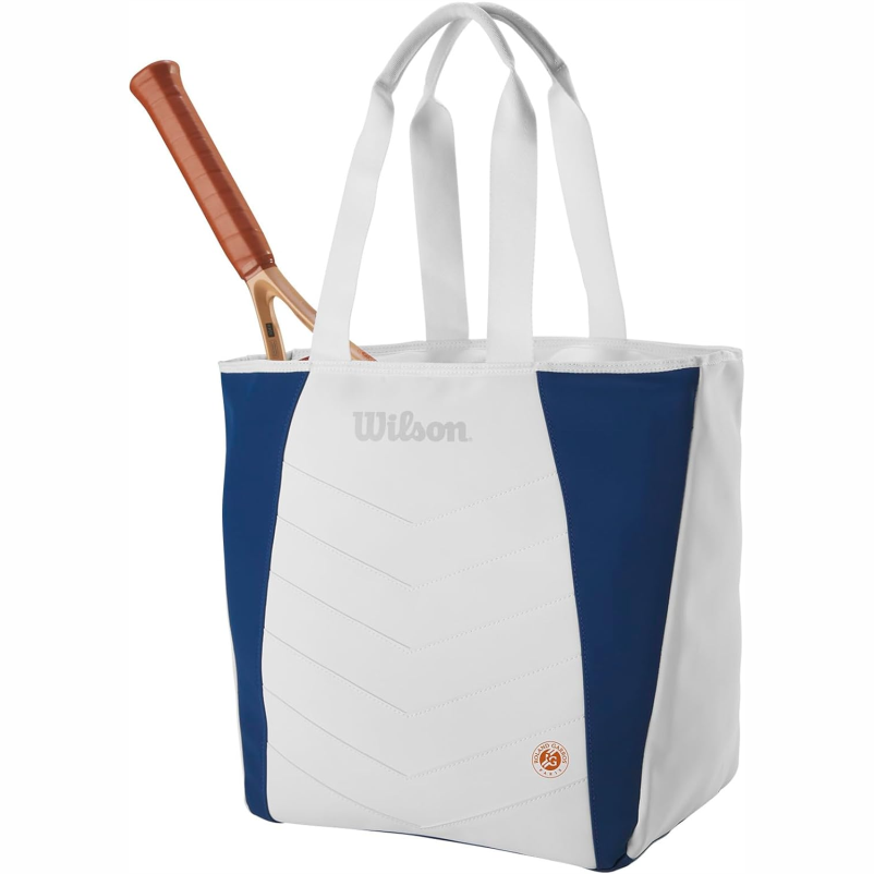 Bolsa de tênis Wilson Roland Garros Tote Premium, com capacidade para até 2 raquetes, compartimentos para notebook, garrafas e acessórios. Design elegante inspirado em Roland Garros, feita em poliéster resistente.