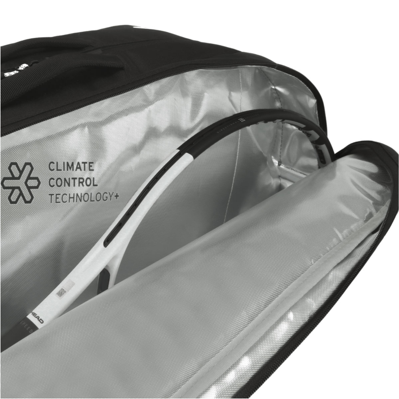Seu compartimento térmico com tecnologia CCT+ protege suas raquetes contra mudanças de temperatura, preservando a tensão das cordas e garantindo maior durabilidade. Além disso, conta com bolso separado para calçados, bolsos externos com zíper para acessórios e objetos pessoais, e alças acolchoadas e ajustáveis para transporte confortável, além de alça de mão prática.